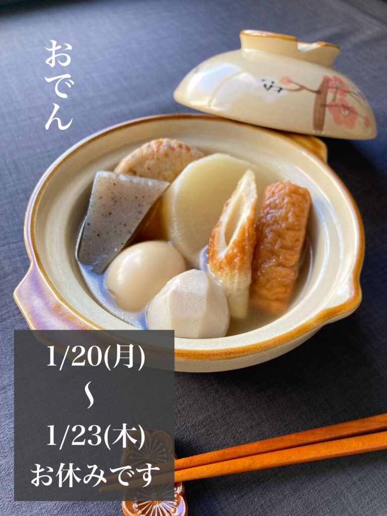 こんにちは来週1/20(月)〜1/23(木)の期間【おでん】をお休みさせていただきます。1/24(金)から再開予定です。よろしくお願いいたします☘️