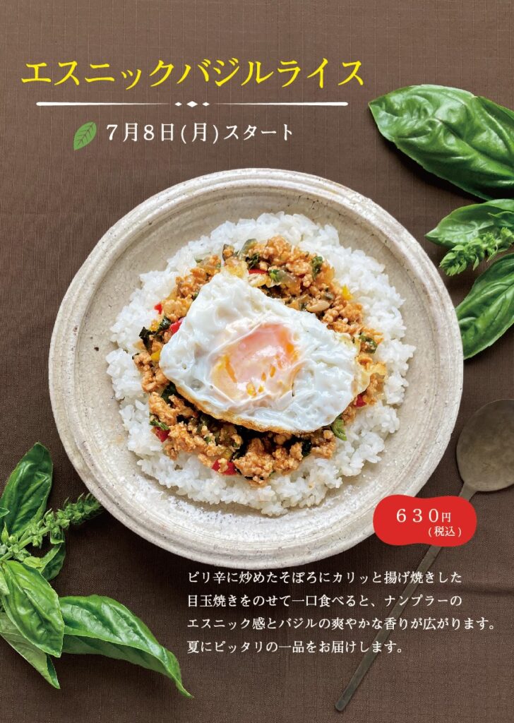 こんにちは☀お待たせしました!夏のメニュー【エスニックバジルライス】始まります🥰ピリ辛に炒めたそぼろにカリッと揚げ焼きした目玉焼きを乗せて🍳ナンプラーのエスニック感とバジルの爽やかな香りが広がります🍃一度食べたら癖になる美味しさです😋🍽この夏ぜひお試しください♪7月8日(月)から始まります。