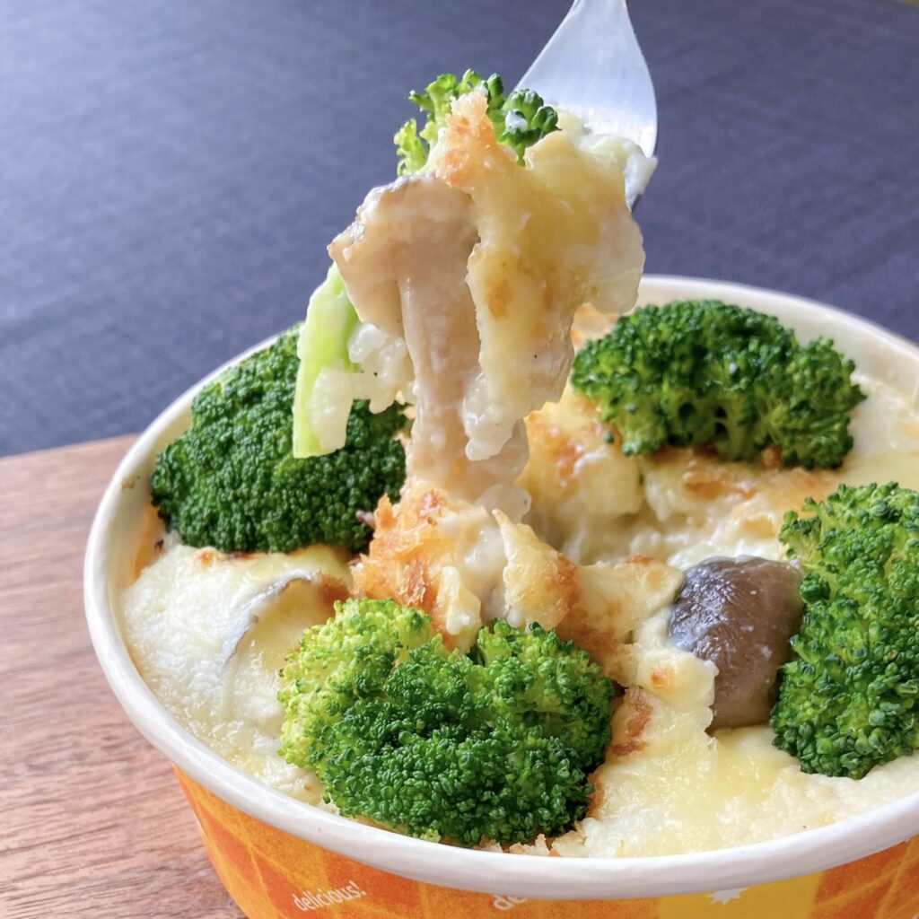 コンソメ風味のピラフの上に、ブロッコリーと鶏肉、しめじ、手作りのホワイトソースをたっぷりかけて、チーズを乗せて焼き上げました。