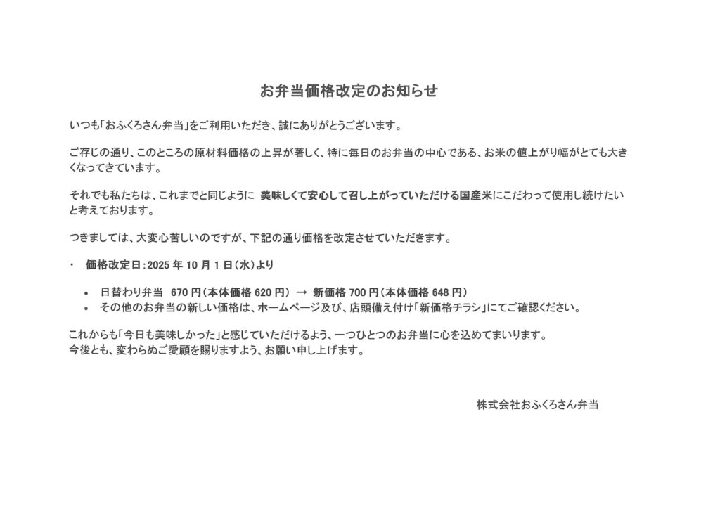 いつもおふくろさん弁当をご利用いただき、ありがとうございます。