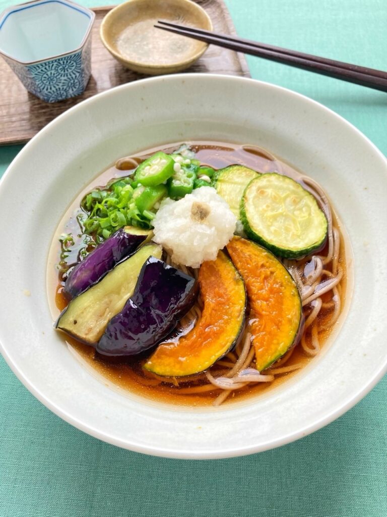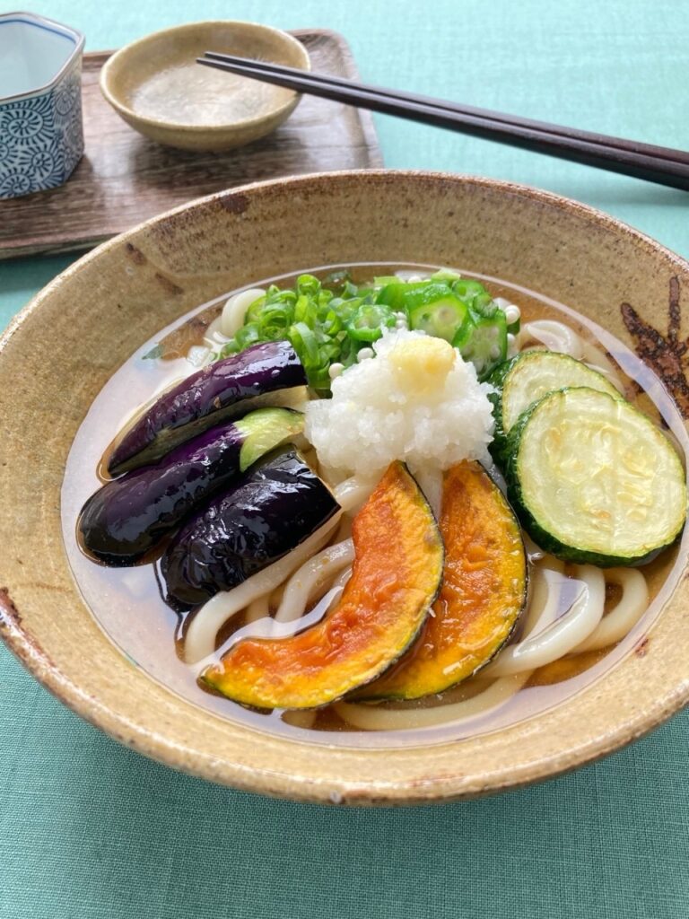 鰹を効かせたたっぷりの出汁の中に、麺と採れたて新鮮な夏野菜を入れてお召し上がりください。