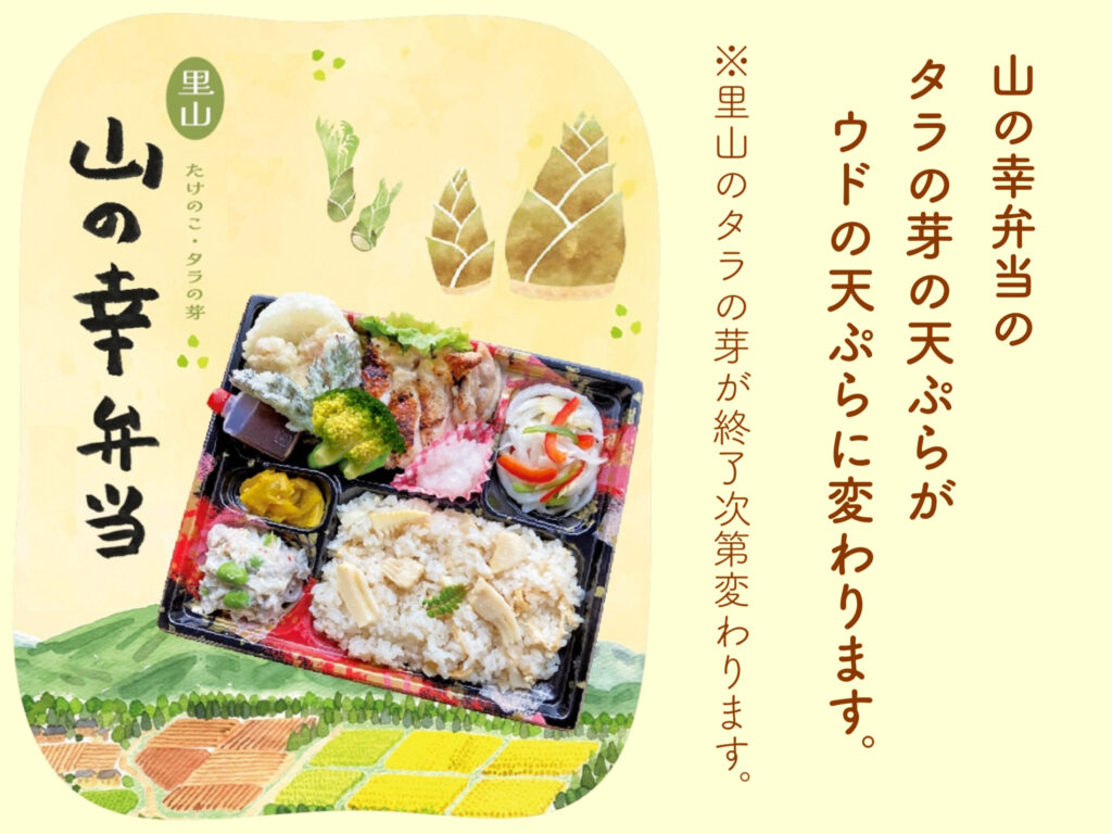こんにちは😊今日は季節のお弁当【山の幸弁当】のメニュー変更と終了のお知らせです。タラの芽の天ぷらが、ウドの天ぷらに変わります。里山のタラの芽が終了次第変わりますので、ご了承ください。(ウドは里山のウドです。)