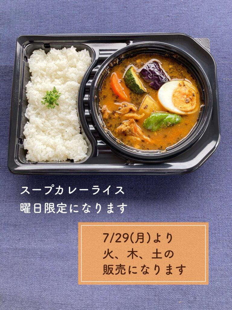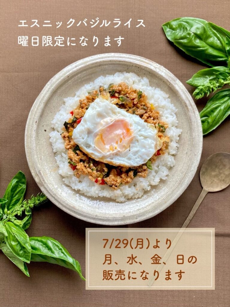 こんにちは☀️今日は曜日限定の販売となるメニューのお知らせです。7/29(月)よりエスニックバジルライスは月、水、金、日 スープカレーライスは火、木、土の販売となります。よろしくお願いいたします。