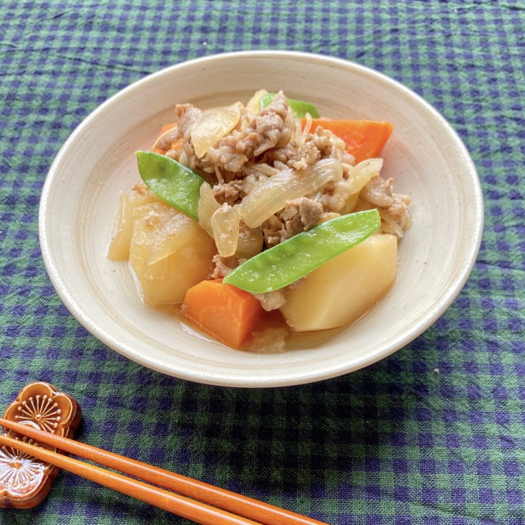 薄切り牛肉、人参、絹さやでつくる彩り豊かな肉じゃがです。